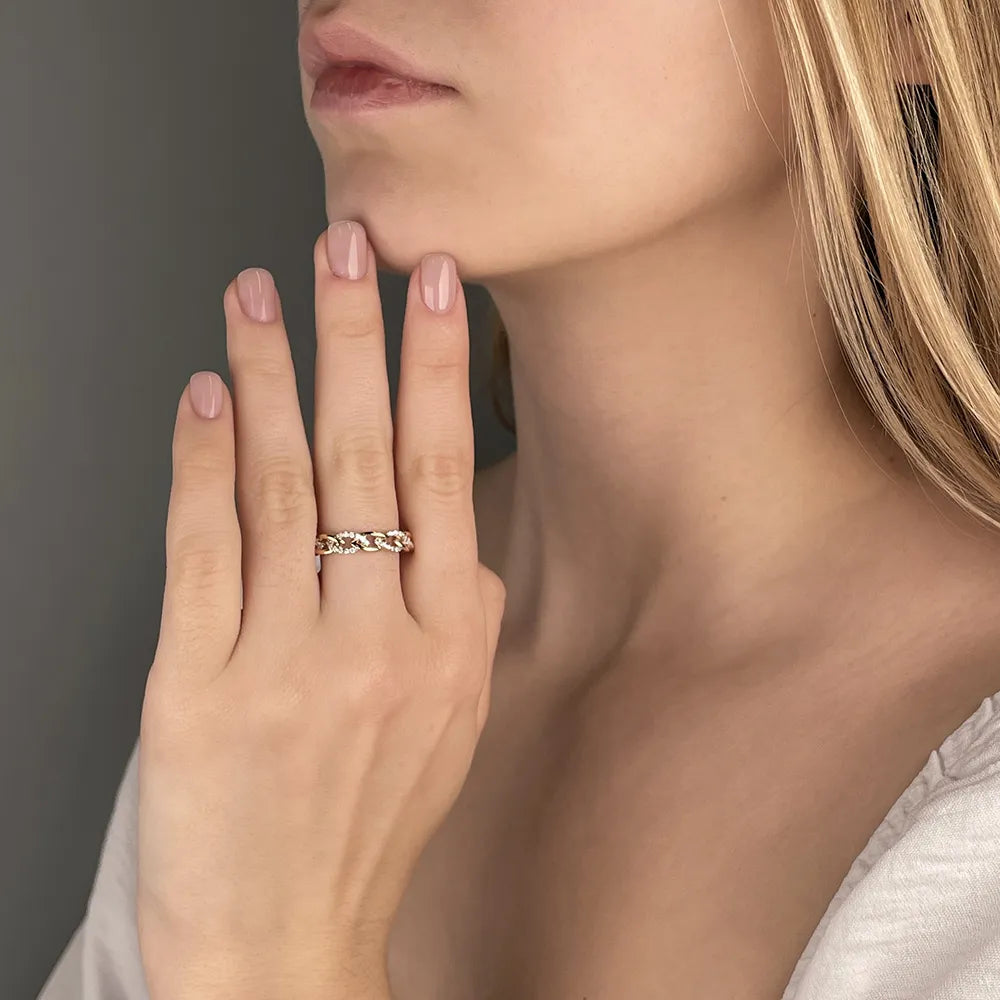 Золота каблучка 585 проби– це елегантна прикраса, що поєднує класичну розкіш з сучасним дизайном. Виготовлена з високоякісного червоного золота, вона має чудову міцність і здатна зберігати свій блиск на довгі роки. Вибір золотої каблучки стане не тільки символом вашого стилю, але й ознакою важливих моментів у житті, таких як заручини чи ювілей. Її елегантний вигляд і бездоганний дизайн роблять цю каблучку універсальним аксесуаром для будь-якої ситуації. Прикраса доповнена вставкою, що надає їй особливого шарму та витонченості.