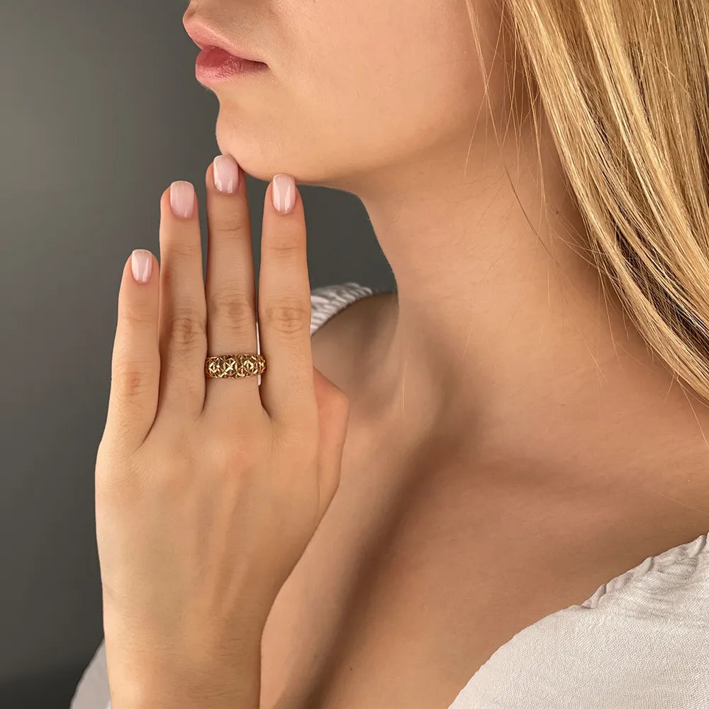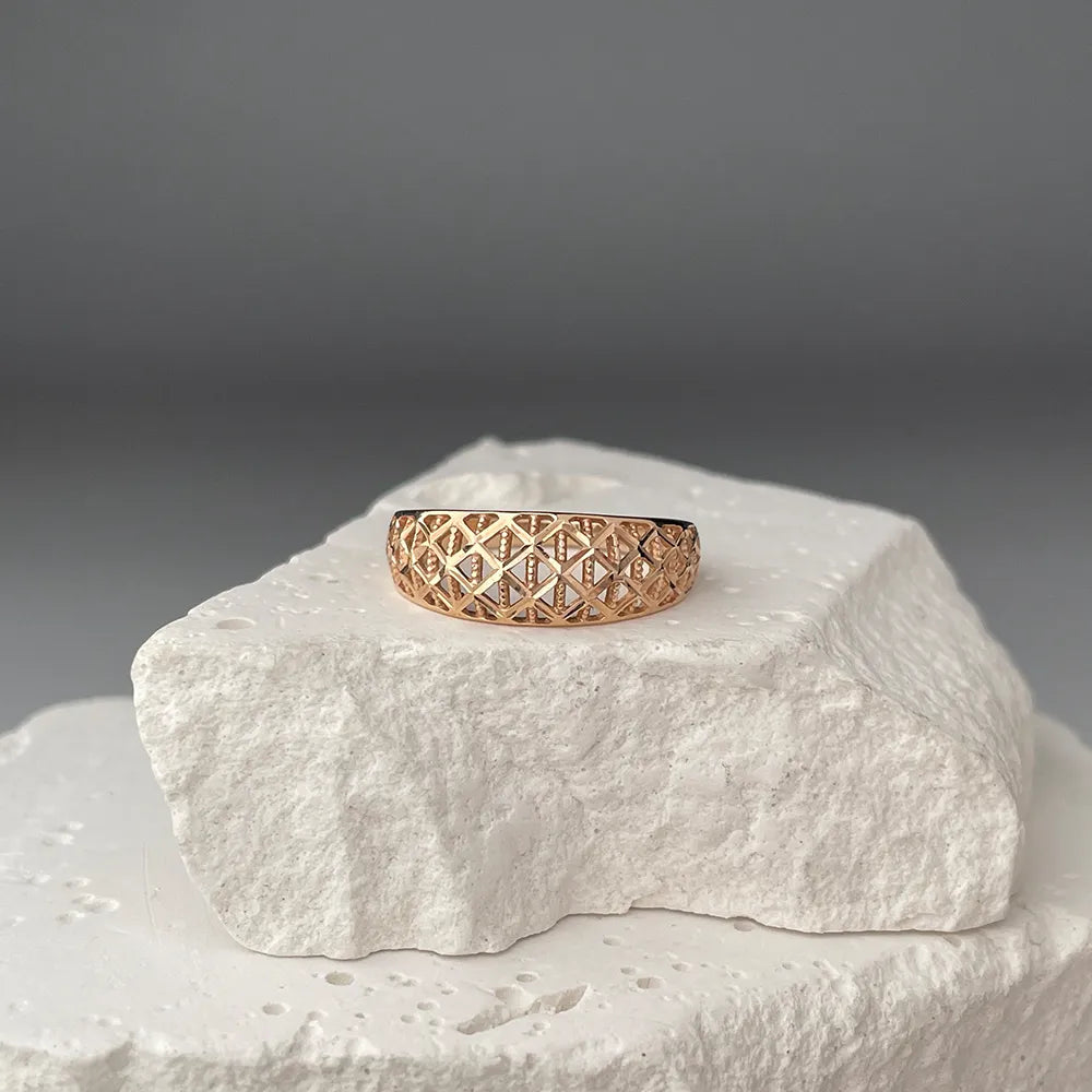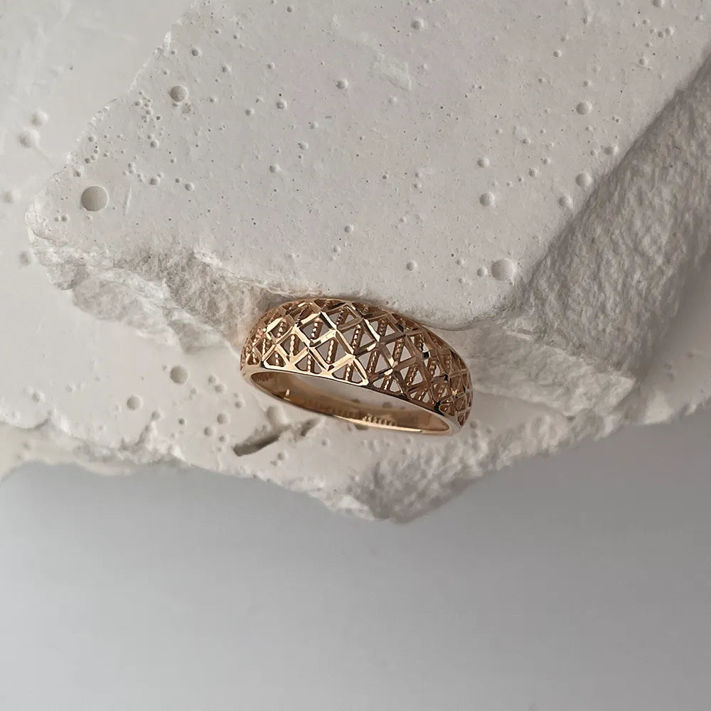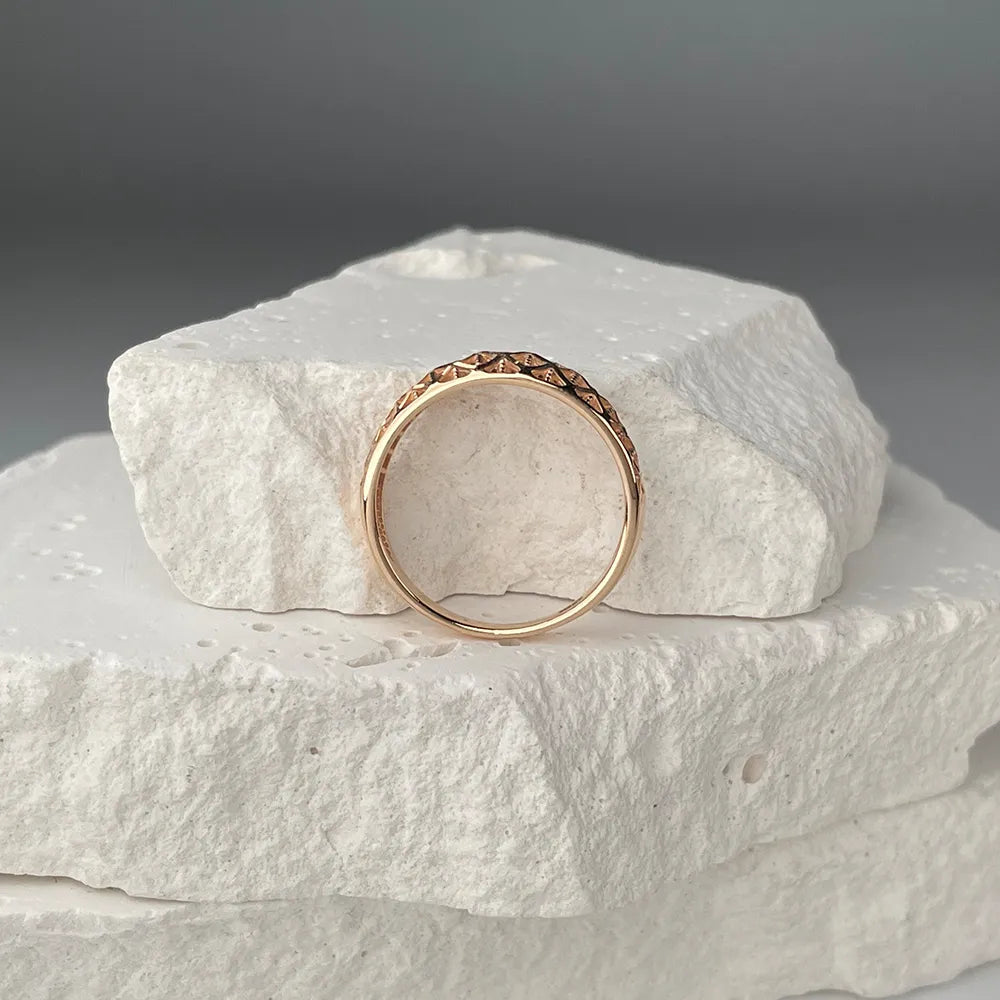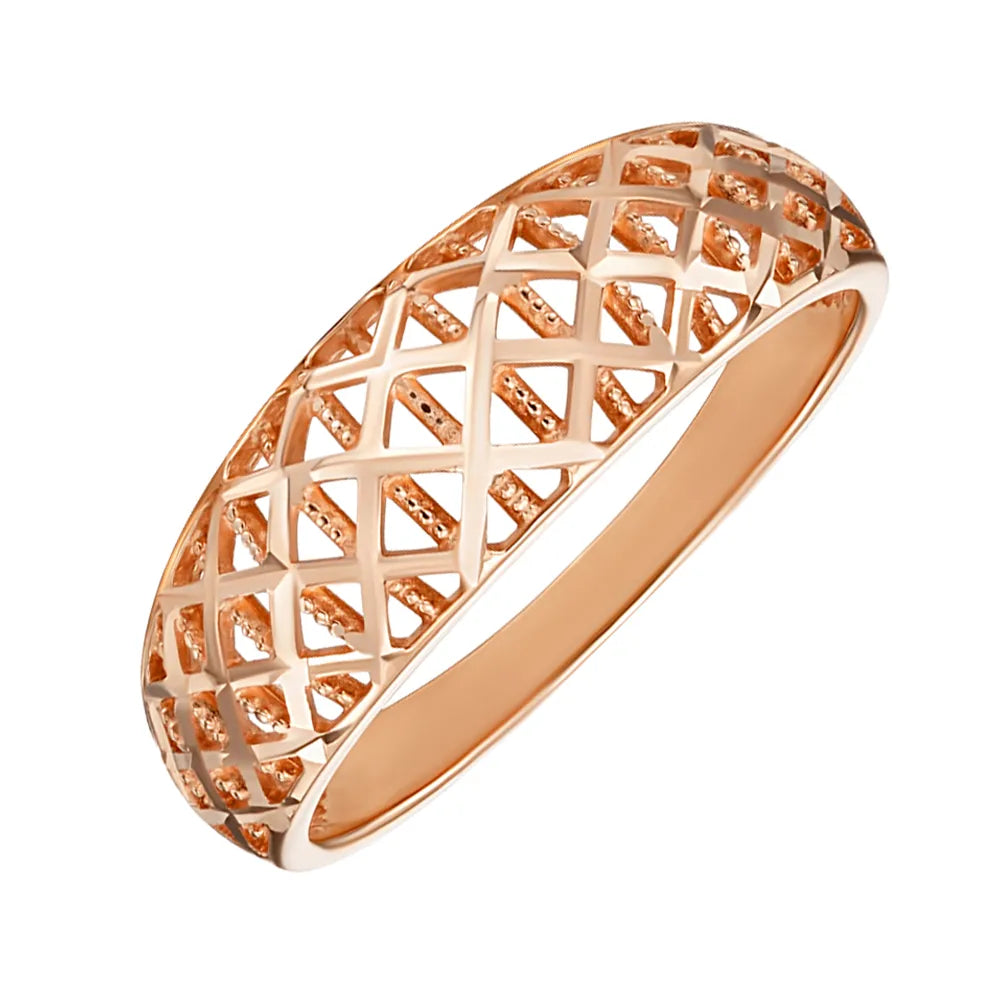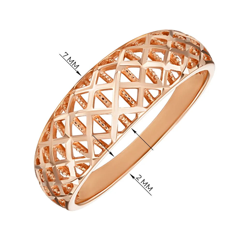 Ефектне жіноче кільце з червоного золота з алмазною гранню має дорогий розкішний дизайн. Навіть за відсутності вставок з дорогоцінним і напівдорогоцінним камінням, його насичені переливи виглядають виразно, ніжно та естетично. Вражаюча ширина, витончені візерунки, діамантове гравіювання - все це робить колечко ідеальним подарунком близькій представниці прекрасної статі. Вручивши дружині, дівчині, сестрі такий аксесуар на День Народження або інше свято, ви продемонструєте свою турботу, теплі почуття, що буде гідно оцінено.