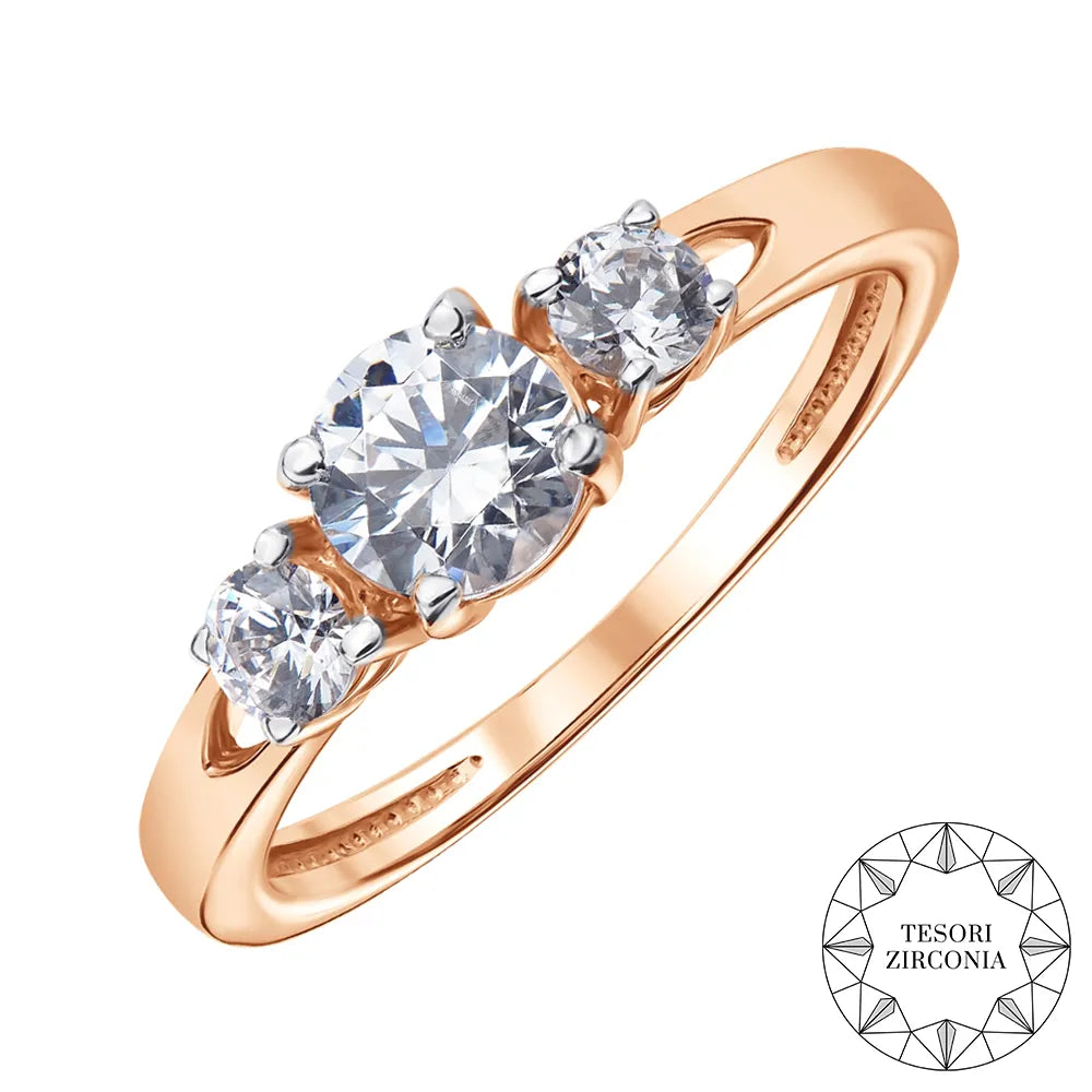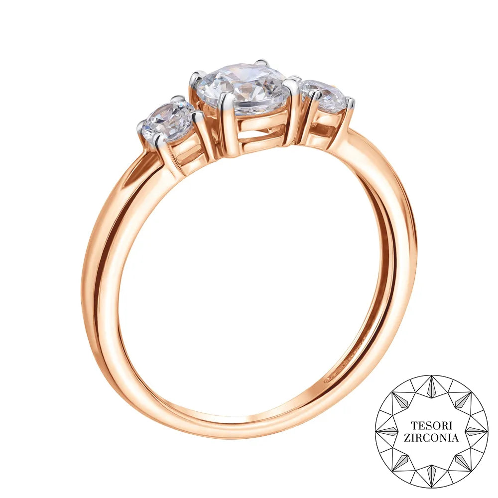 У центрі уваги – розкішний круглий фіаніт вагою 0,85 карата, оточений двома дрібнішими круглими фіанітами загальною вагою 0,41 карата. Їх бездоганна ограновування та сліпучий блиск створюють приголомшливий ефект, немов це справжні діаманти.