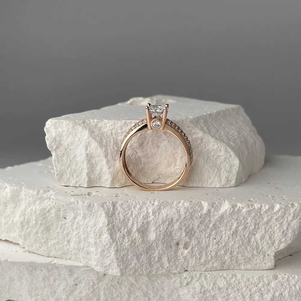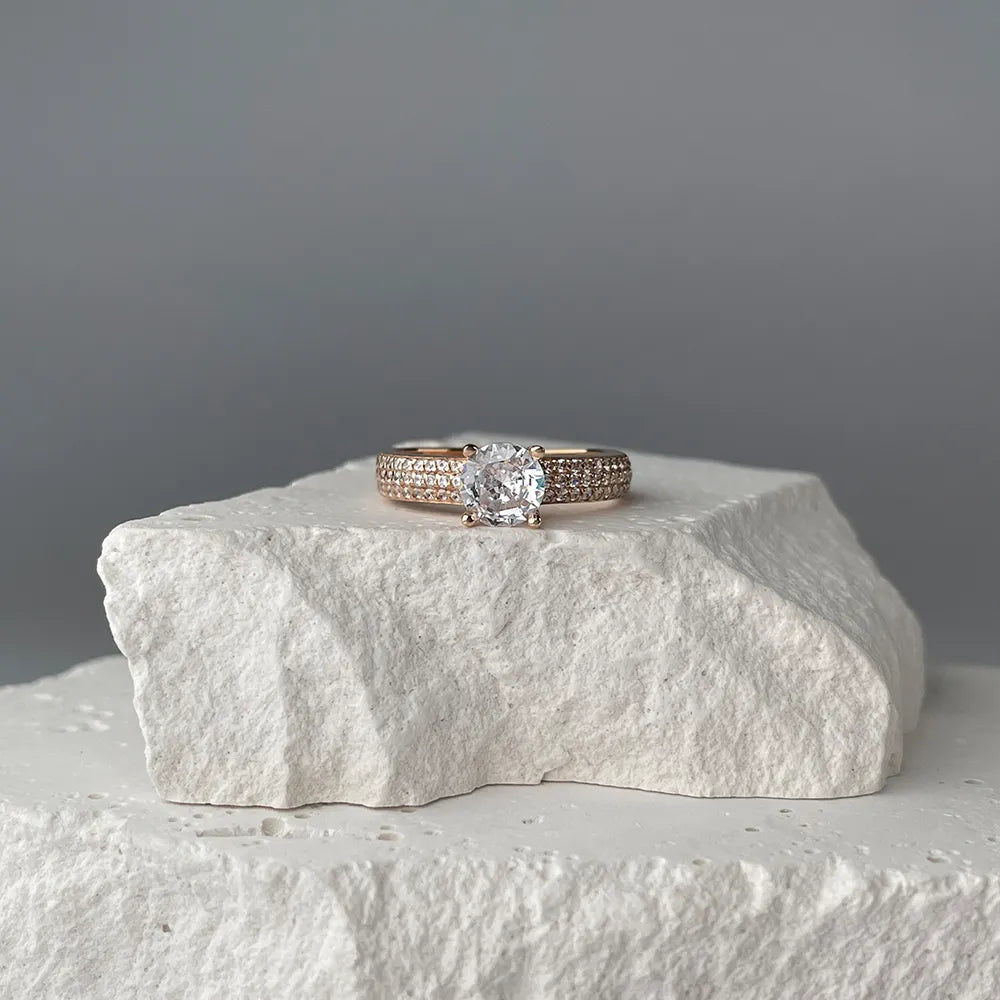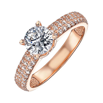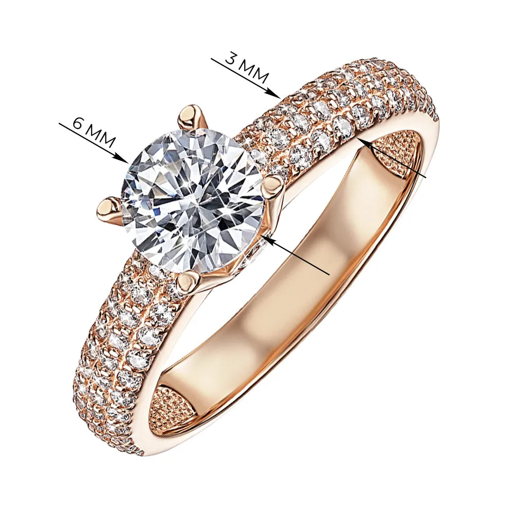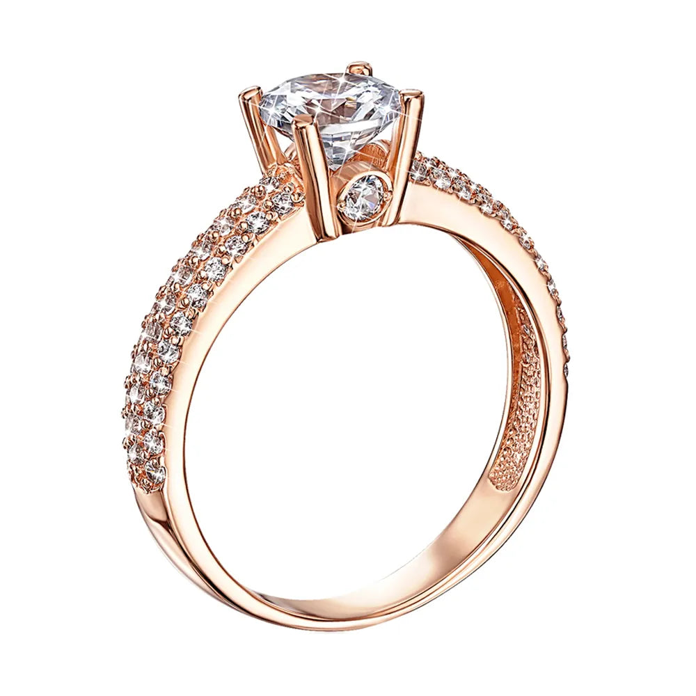 Кільце з червоного золота з фіанітом - дорогий подарунок для серця дами. Цей аксесуар з цілим розсипом каміння виглядає так шикарно, що не сподобатися він просто не може.