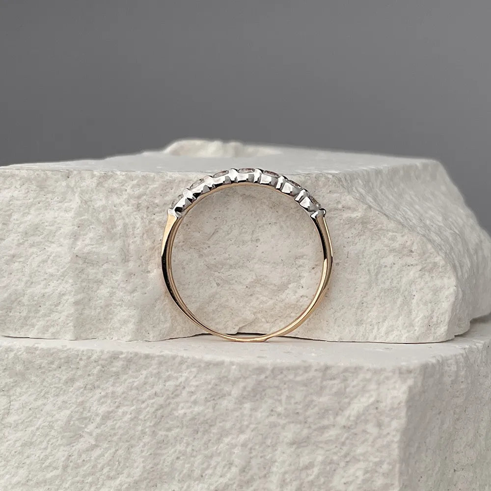 Бездоганне виконанняКільце виконане із золота 585 проби в оригінальному двоколірному виконанні. Особливу міцність та благородний блиск виробу надає родієве покриття, яке захищає прикрасу від потьмарення та механічних пошкоджень. Дизайн кільця виконаний у популярному стилі "доріжка", де сім білосніжних фіанітів круглого огранювання загальною вагою 0,624 карата створюють ефектну лінію, що символізує нескінченну красу та грацію.