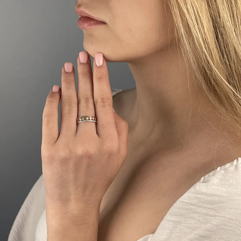 Золота каблучка 585 проби– це елегантна прикраса, що поєднує класичну розкіш з сучасним дизайном. Виготовлена з високоякісного червоного золота, вона має чудову міцність і здатна зберігати свій блиск на довгі роки. Вибір золотої каблучки стане не тільки символом вашого стилю, але й ознакою важливих моментів у житті, таких як заручини чи ювілей. Її елегантний вигляд і бездоганний дизайн роблять цю каблучку універсальним аксесуаром для будь-якої ситуації. Прикраса доповнена вставкою, що надає їй особливого шарму та витонченості.