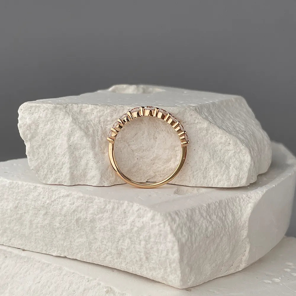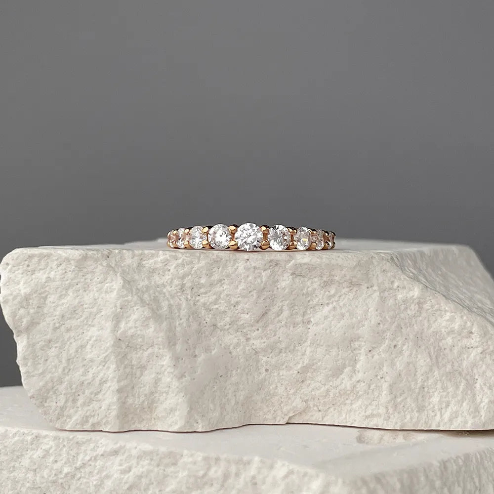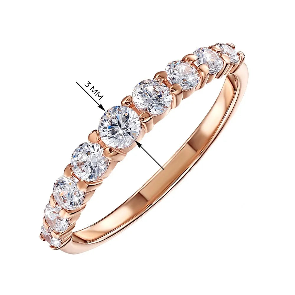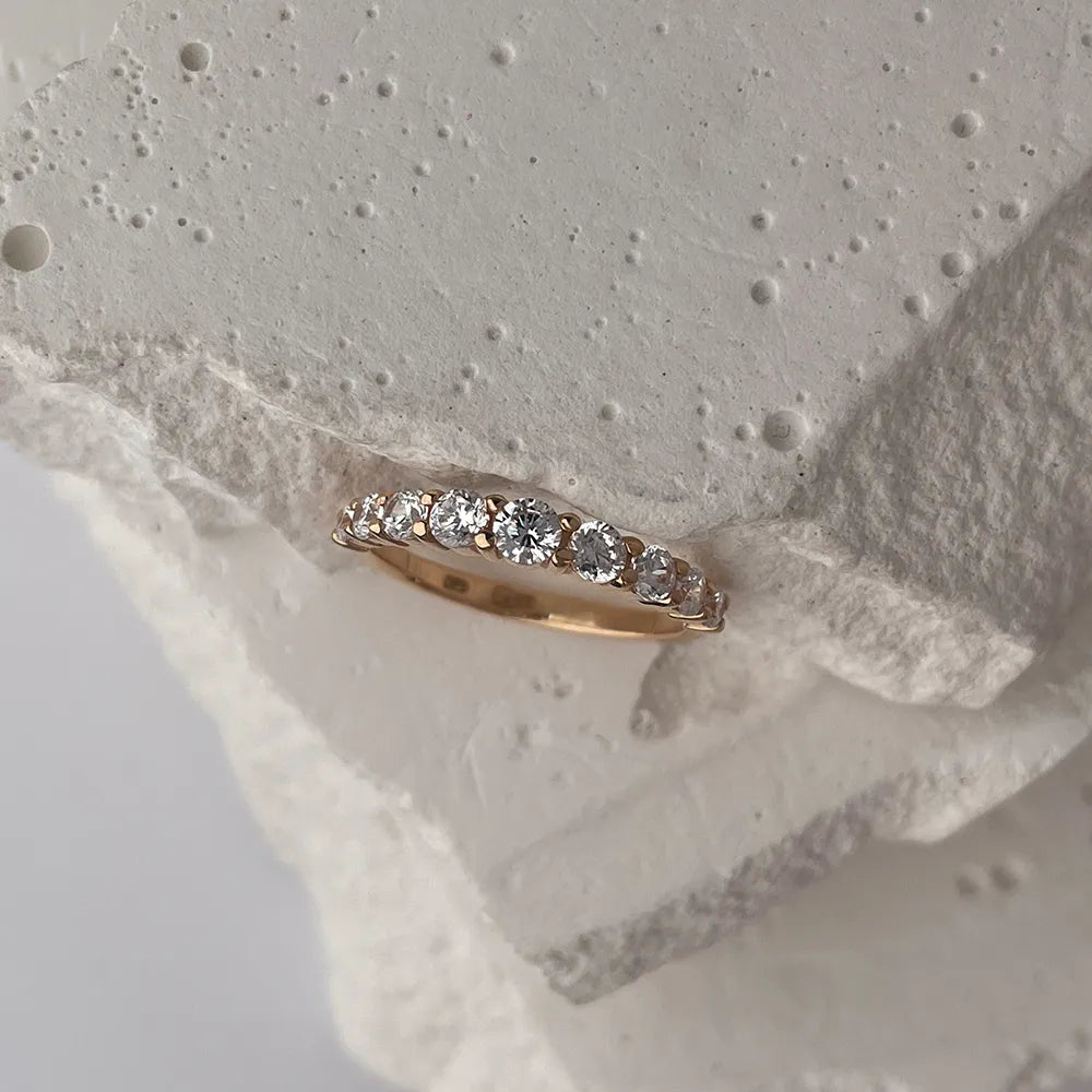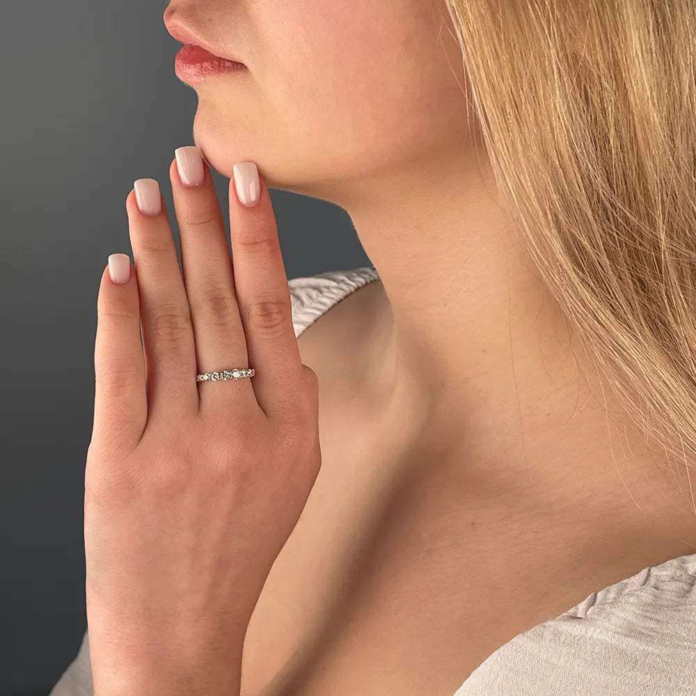 Кільце виконане з червоного золота 585 проби, яке традиційно асоціюється з міцними сімейними цінностями та довговічністю стосунків. Його глибокий і теплий відтінок чудово поєднується з фіанітами Tesori Zirconia, ограненими у вигляді кола. Каміння створює відчуття чистоти та витонченості, ідеально доповнюючи традиційний український стиль "доріжка", який часто зустрічається в ювелірних прикрасах.