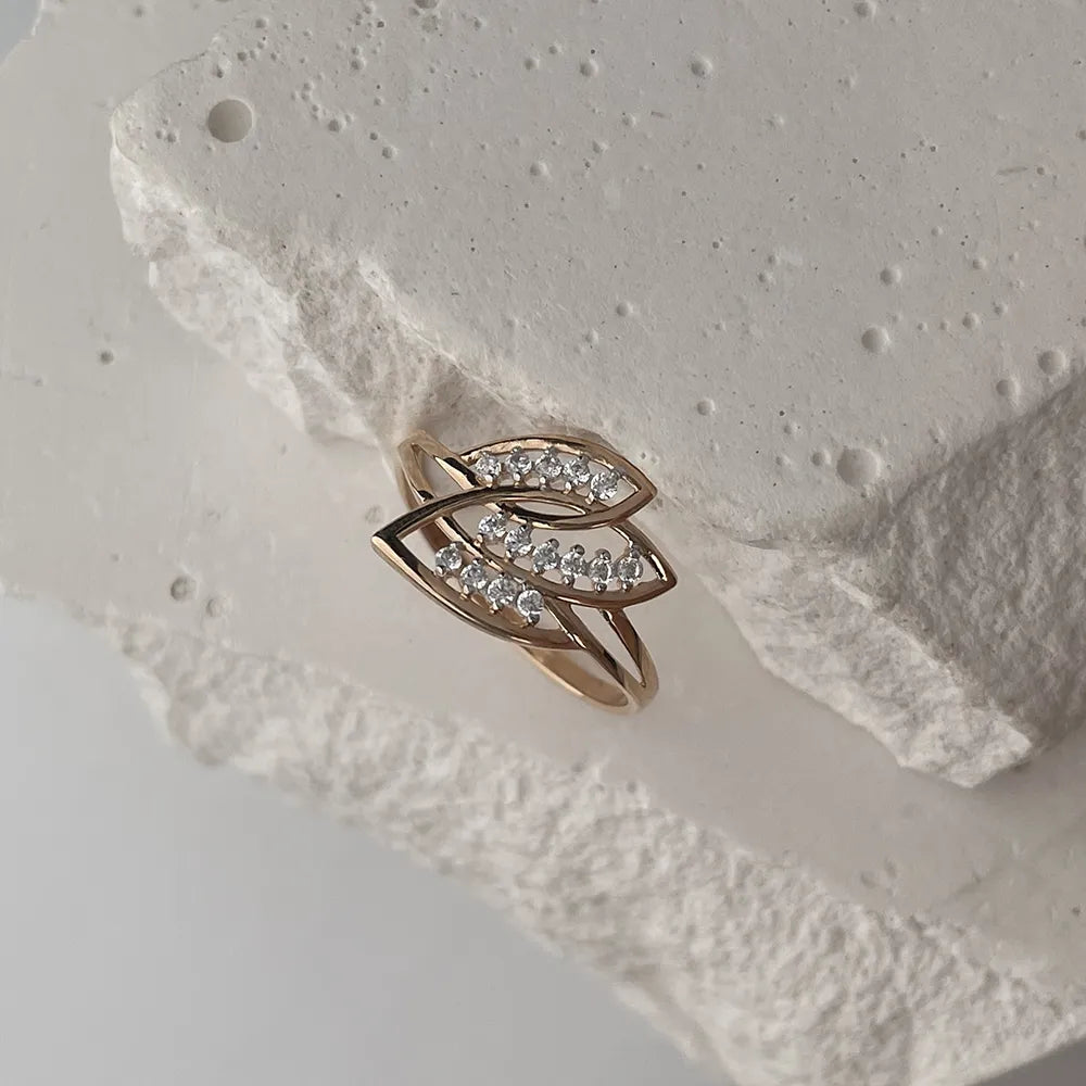 The presented jewelry is not just an accessory, but a symbol of impeccable taste. A delicate ring made of 585 red gold with an elegant coating is created in a unique "leaf" style with a thin weave and a scattering of snow-white cubic zirconias. Round-faceted stones give the product a special romanticism and femininity.