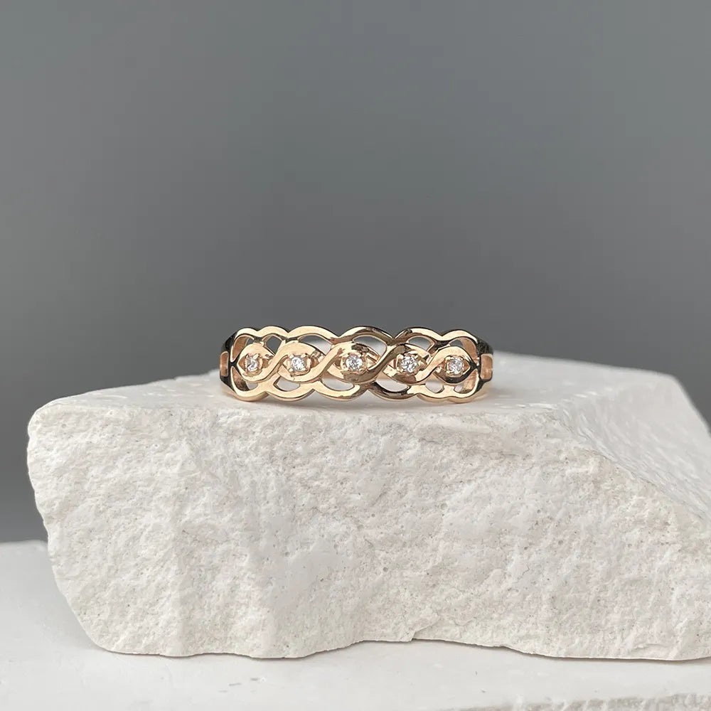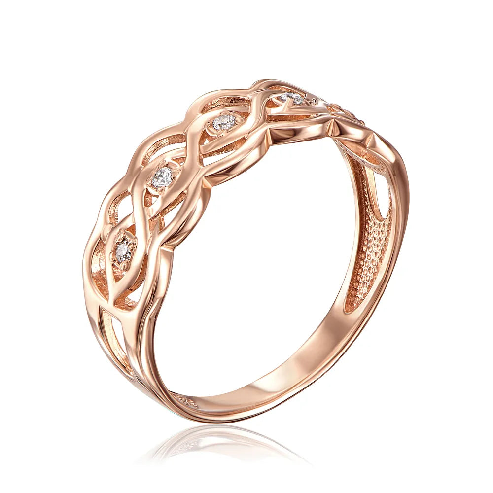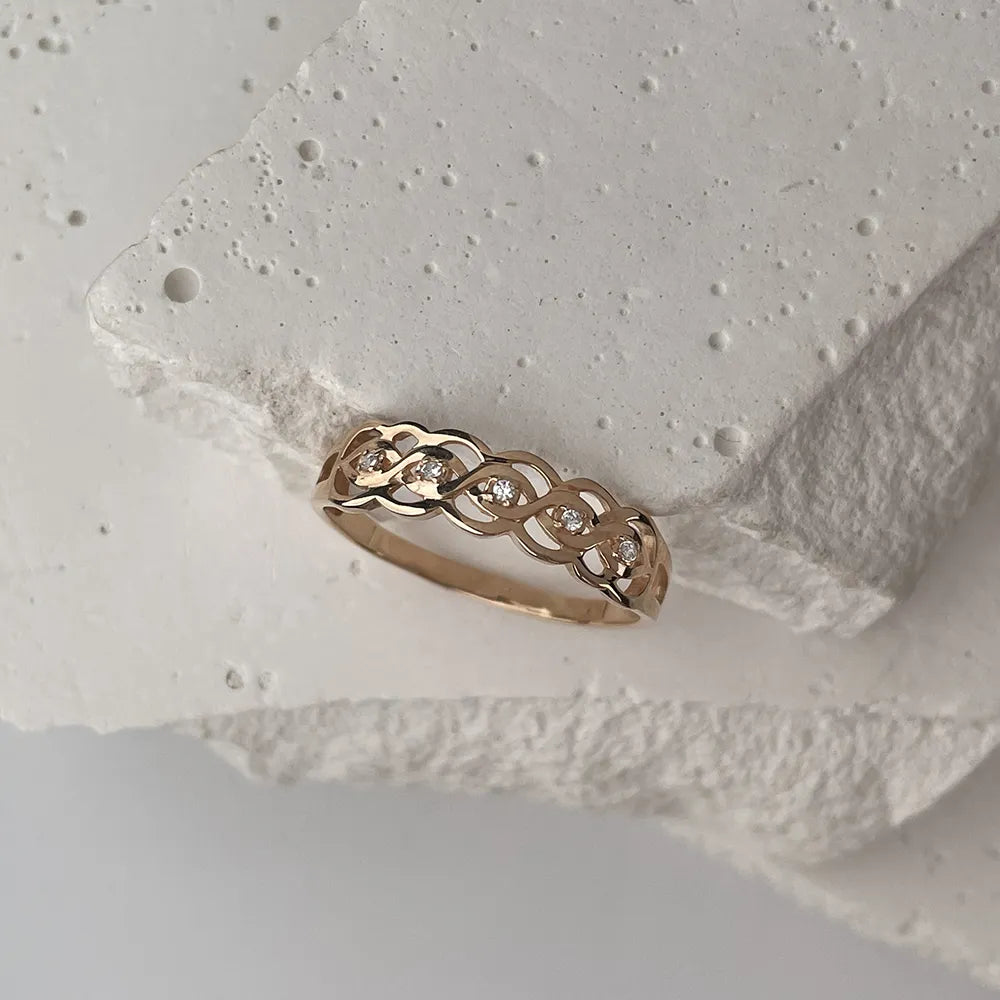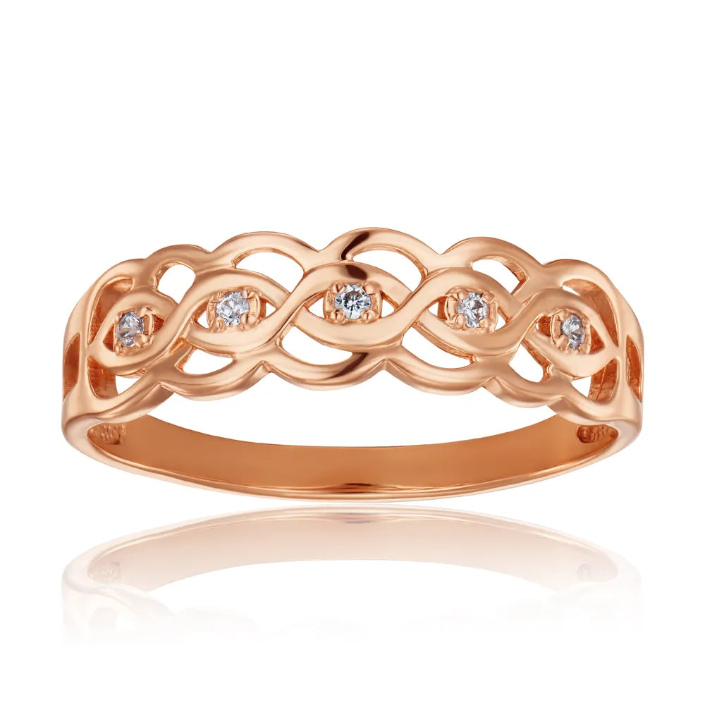 A red gold ring with cubic zirconia in the form of an ornament will be a wonderful gift that any woman will appreciate.