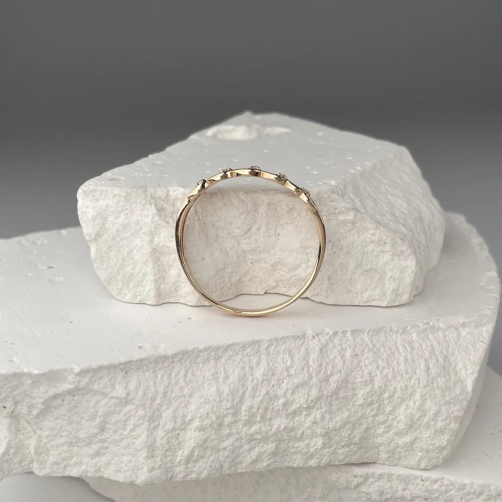 The ring is integrated with 5 round cubic zirconias of the same size, each weighing 0.082ct. The stones are securely fixed in the gold setting with a clasp, so the owner of the jewelry can not worry about losing the crystals. Each stone has a jeweler's cut, which provides sparkling shimmering effects when the rays of light hit it. The play of reflections of the red precious metal and shimmering stones creates a real fireworks display.