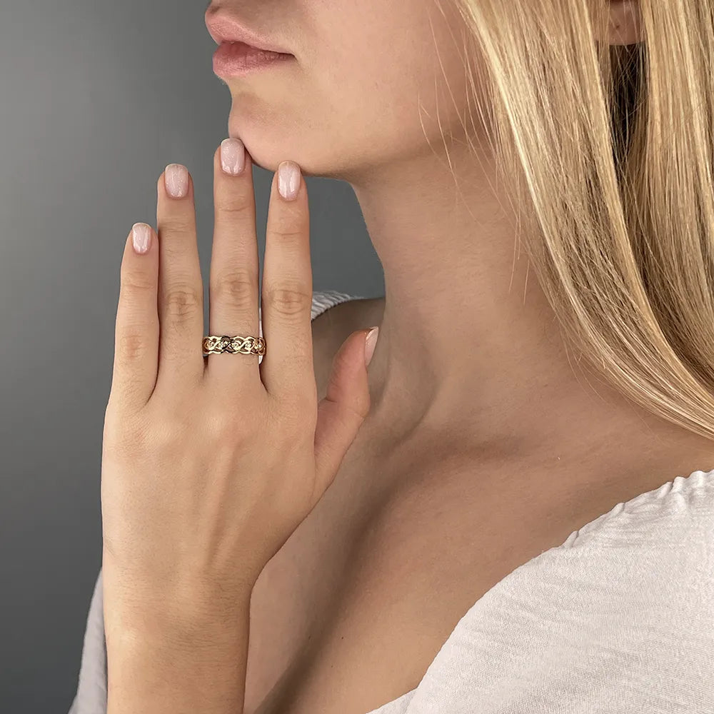 A gold ring with cubic zirconia in the "ornament" style is an exquisite piece of jewelry that conquers hearts with its intricate design. It is an ideal option for both a young girl and an older lady. The elegant weaves inlaid with transparent crystals radiate respectability and luxury, and the ring can be worn with a variety of outfits - from casual jeans, business suits to romantic, festive, cocktail dresses.