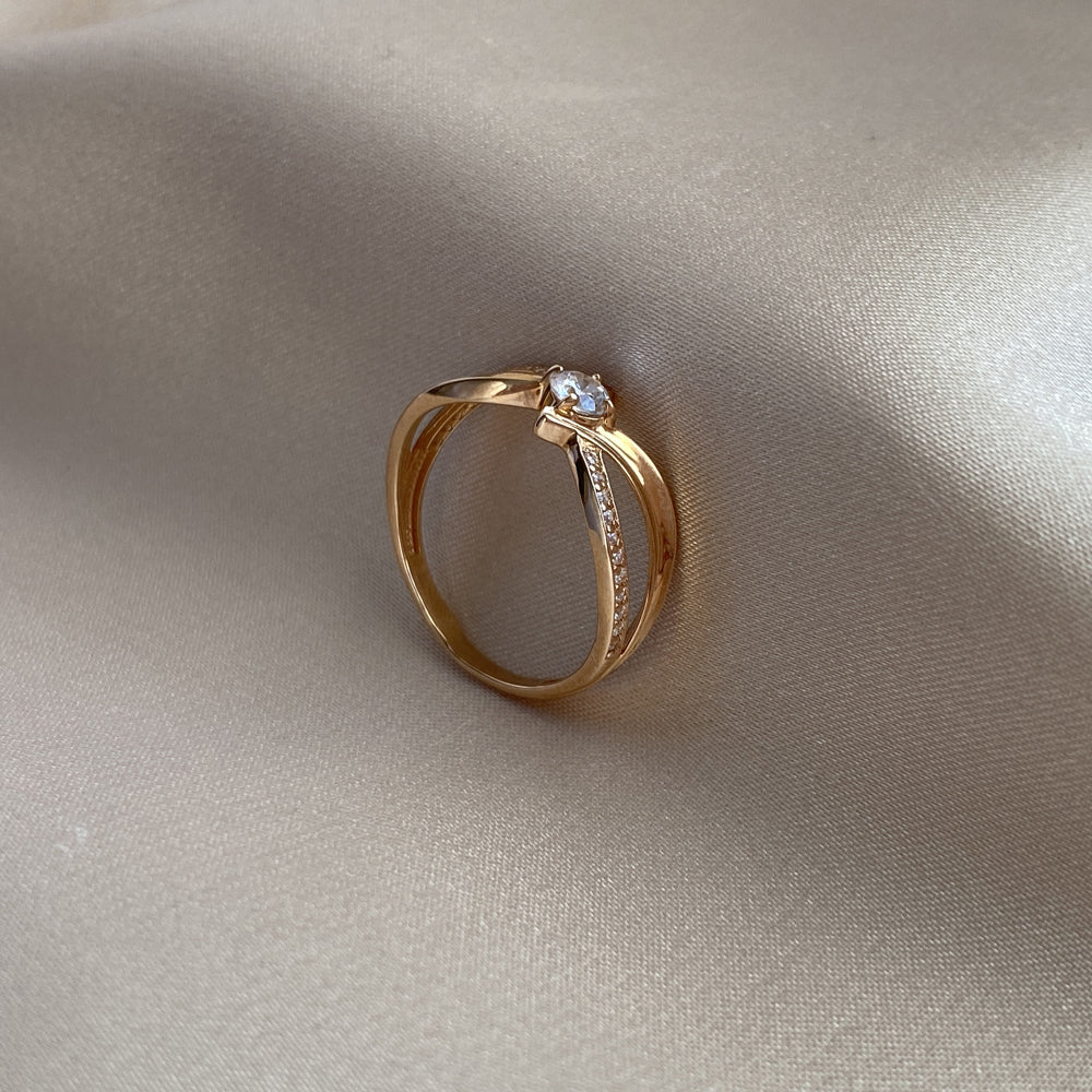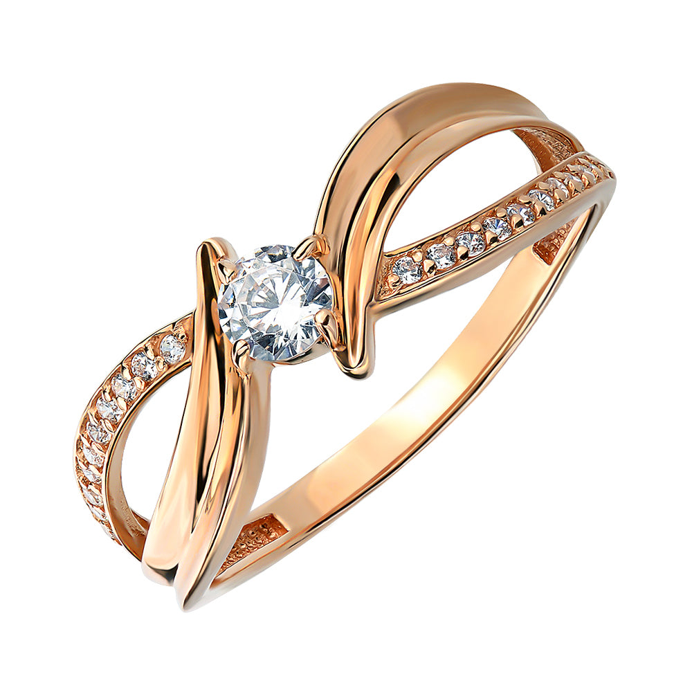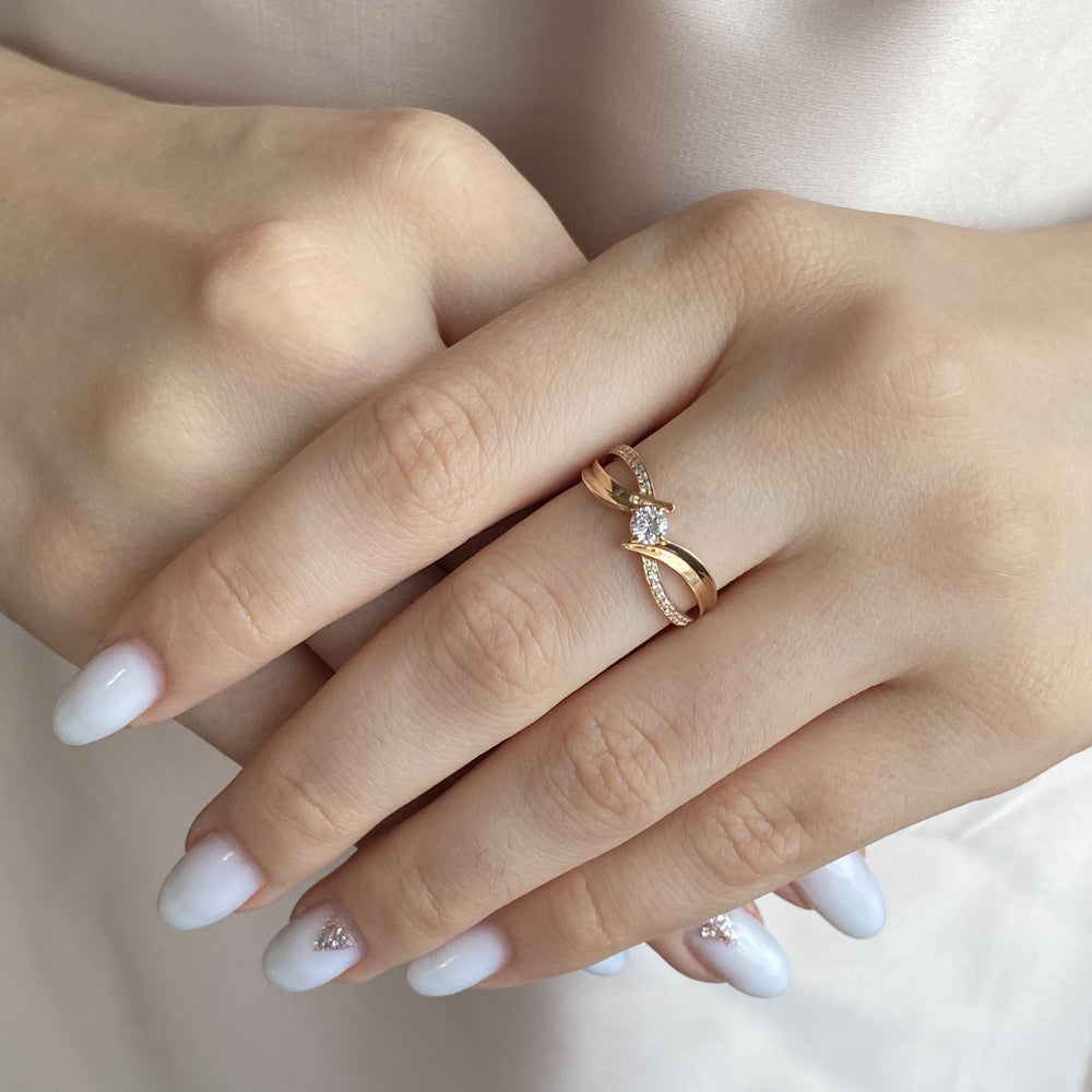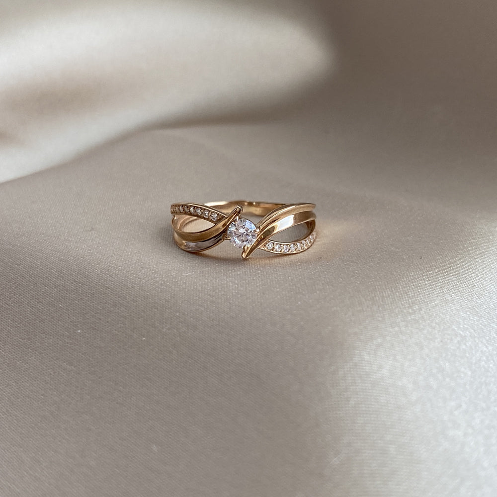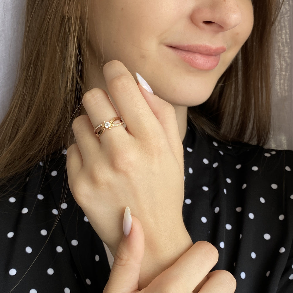 A ring made of red gold and cubic zirconia looks luxurious: a large central stone and a scattering of tiny white stones are complemented by a wave-shaped band. Such a beautiful thing will appeal to girls and women of any age. It is given as a gift on the occasion of a birthday, anniversary, wedding anniversary, Valentine's Day and other public and personal holidays.