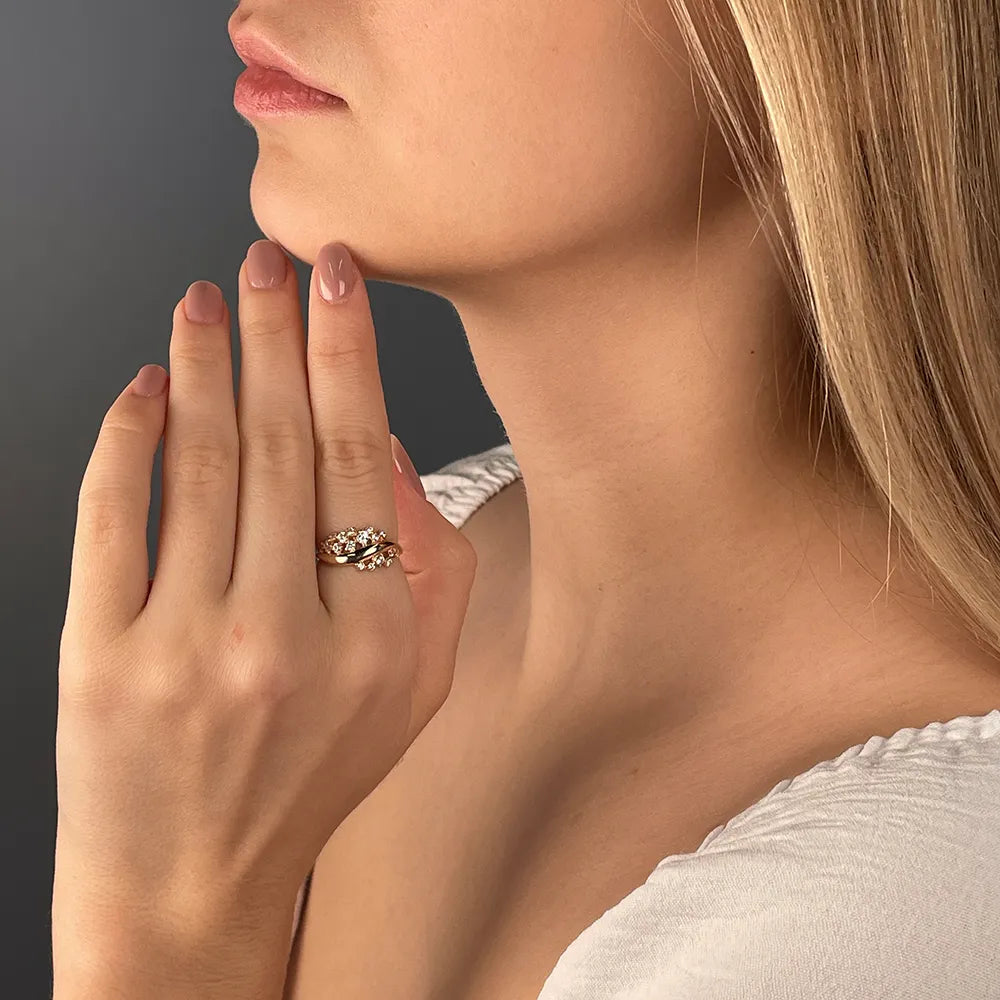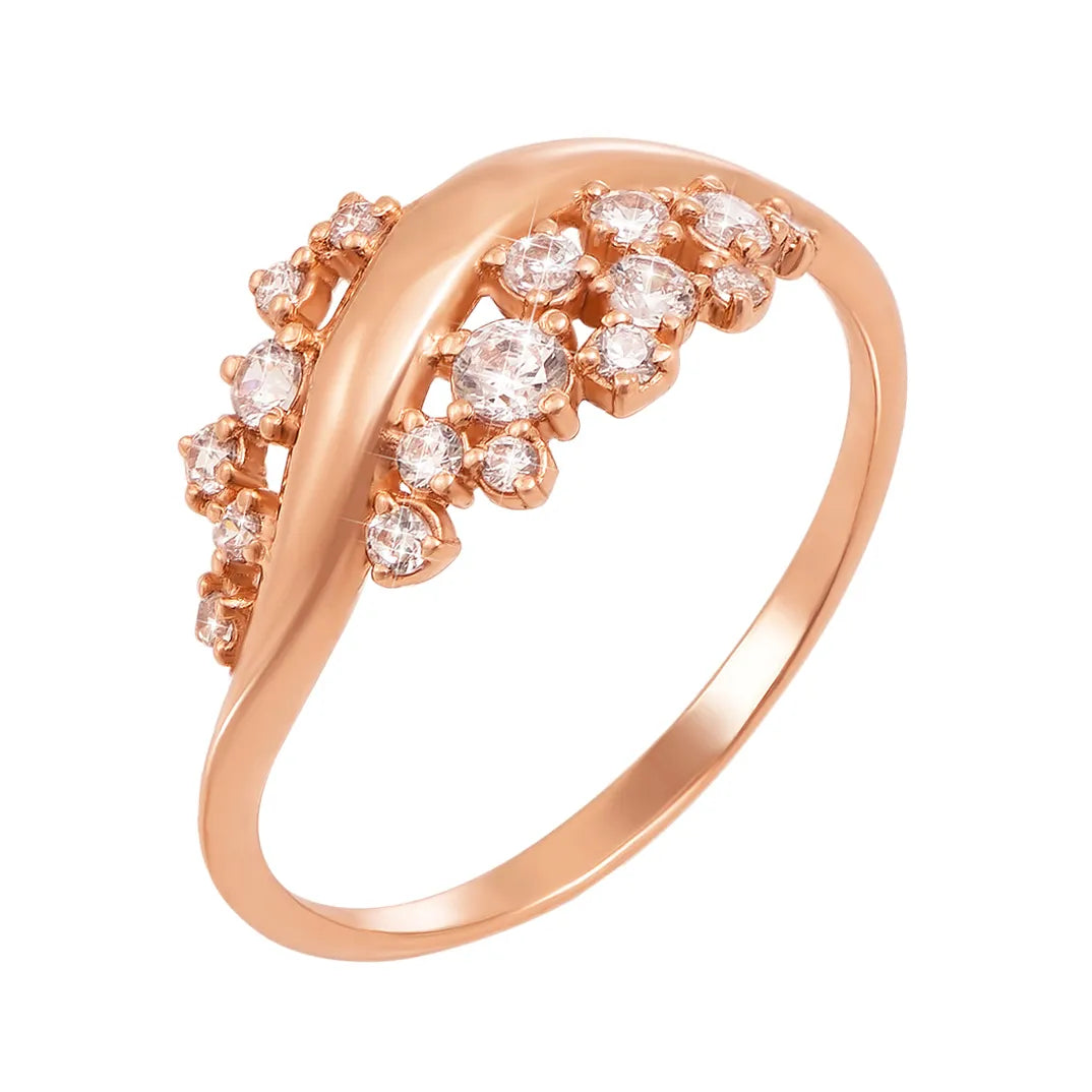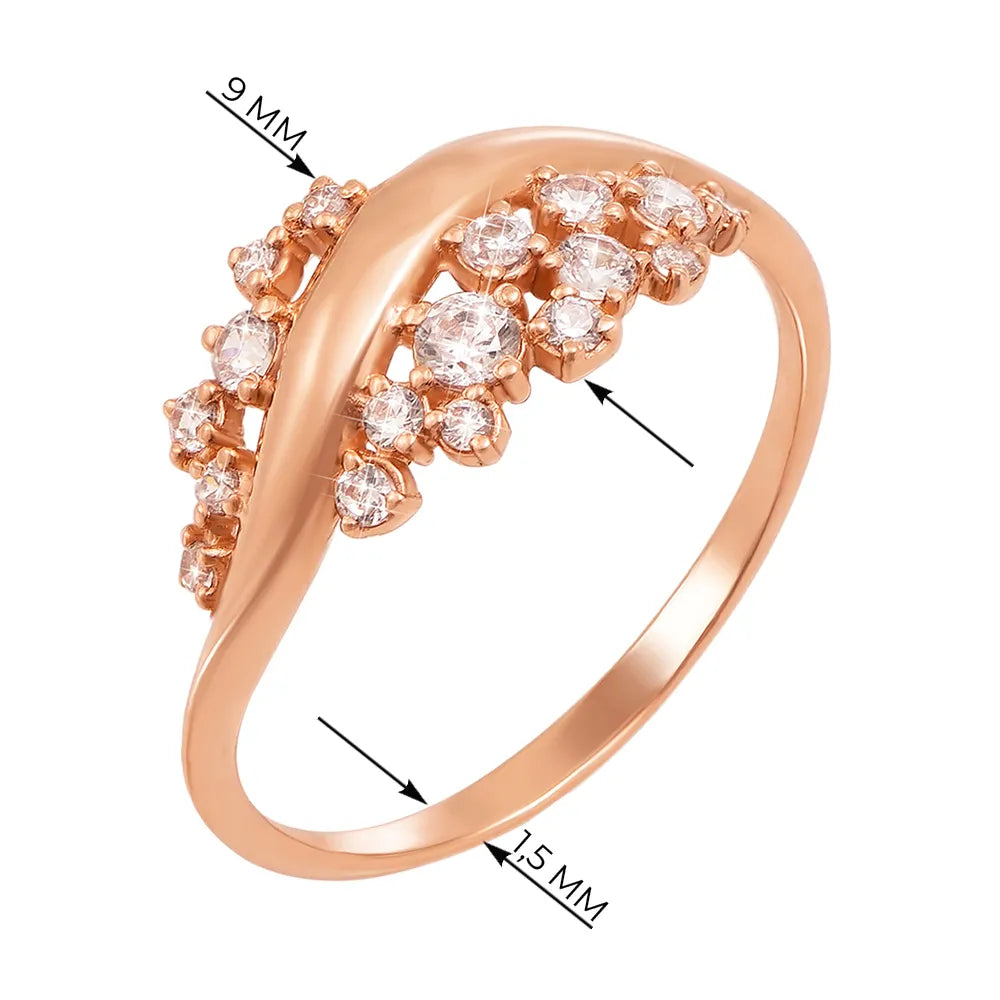 Red gold metal looks expressive, gives depth and mystery to each stone. Women's ring with cubic zirconia is made in the shape of a wave. It looks elegant on a girl's finger. The Ukrzoloto website presents a model in size 15.5, weighing 1.64 g, but you can also choose a product in other sizes from 16 to 19.5.