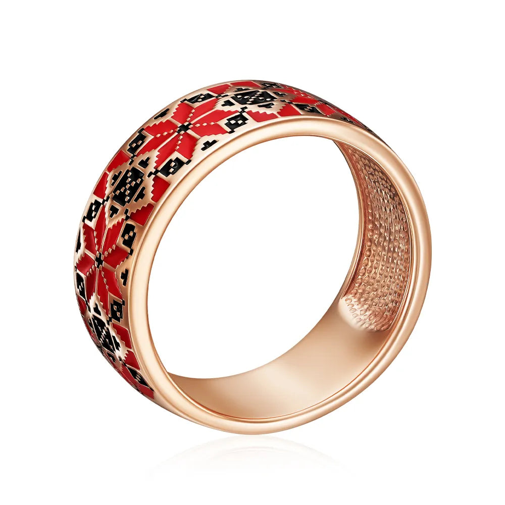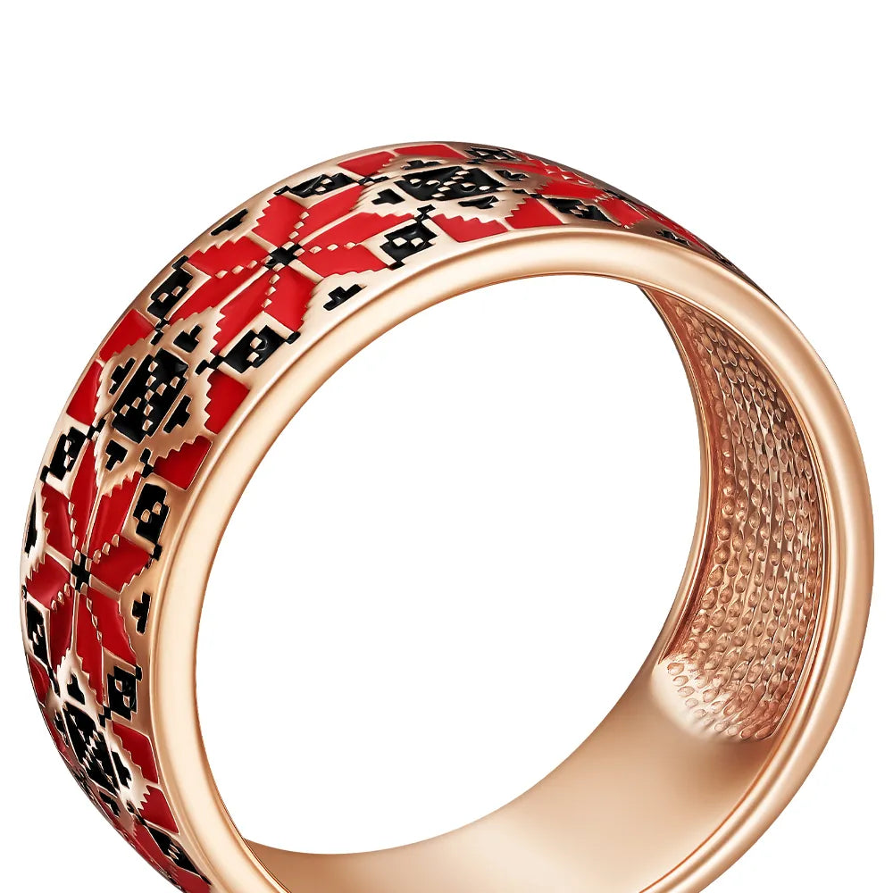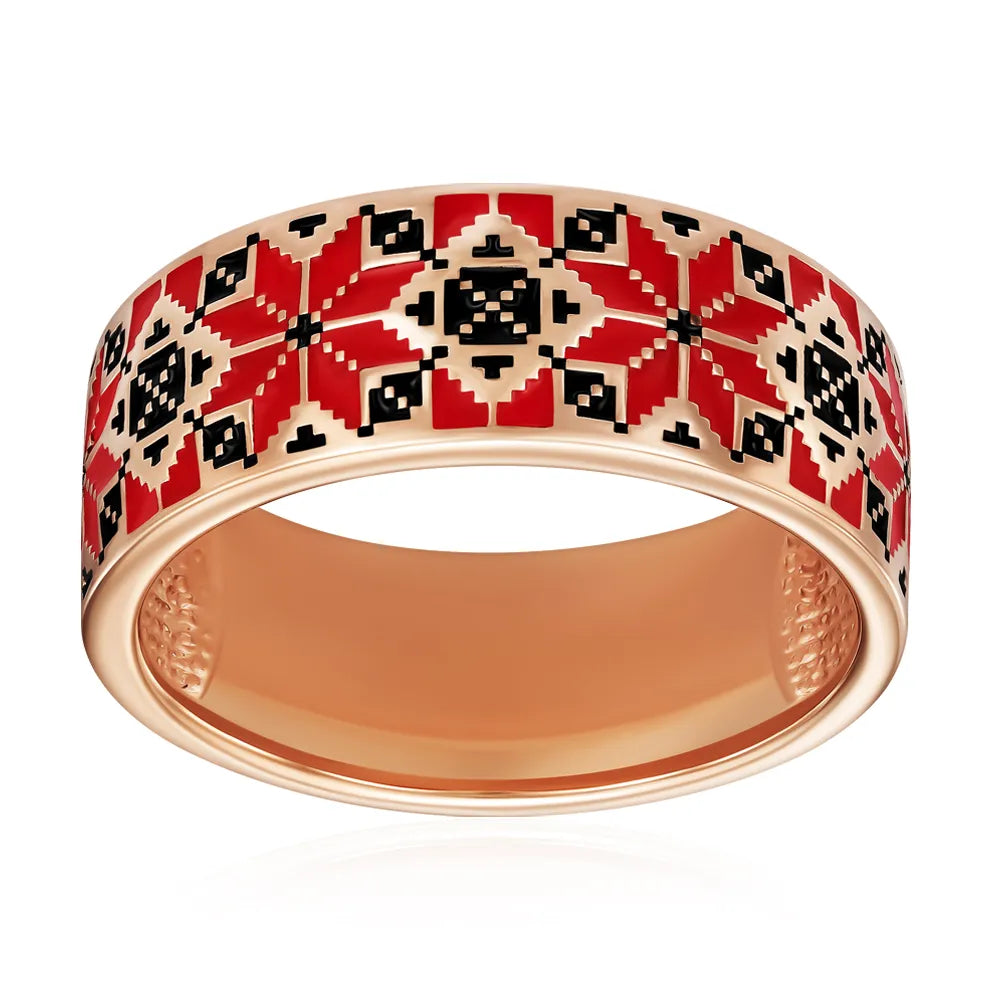 Ten elegancki pierścionek wykonany jest z czerwonego złota próby 585, symbolizującego luksus i wyrafinowanie. Uwagę przyciąga dekoracyjna wstawka z emalii, wykonana w tradycyjnych kolorach ukraińskiego haftu – czarnym i czerwonym.