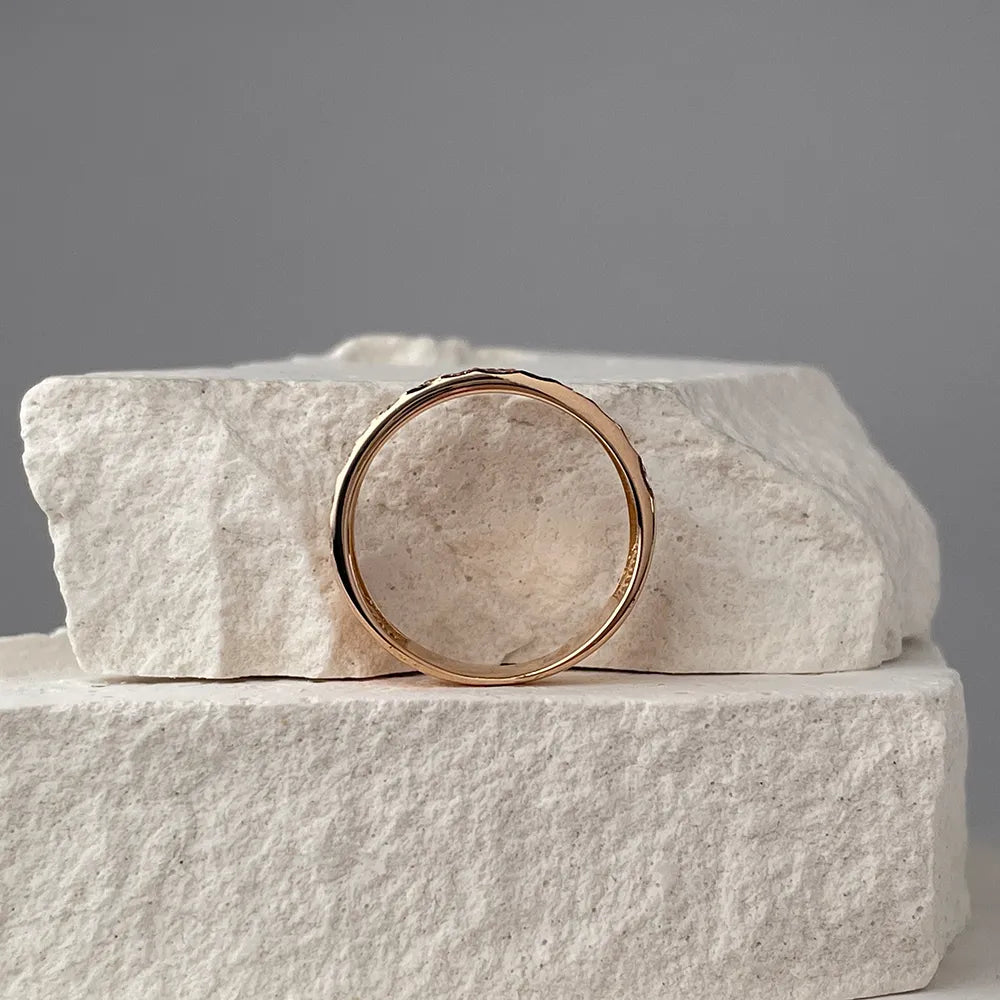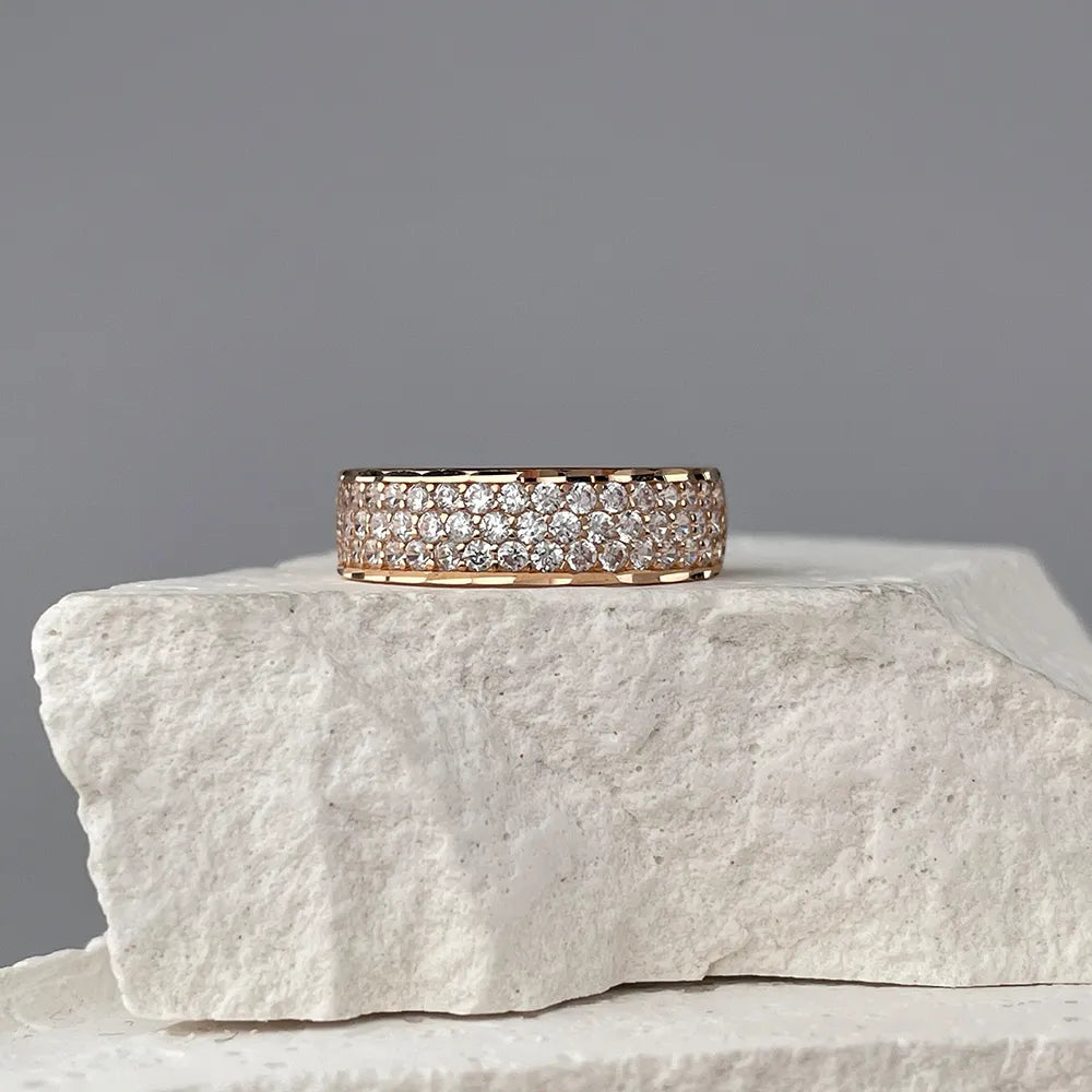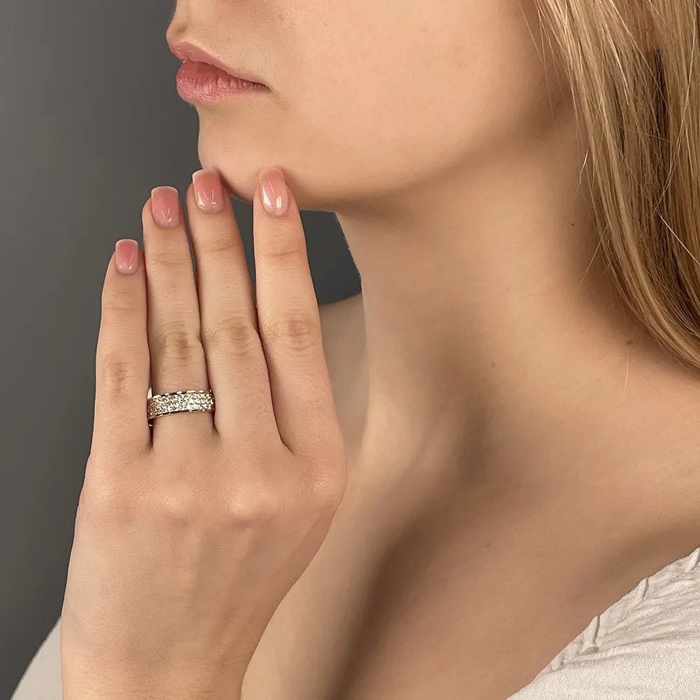 Pierścionek wykonany jest z trwałego czerwonego złota próby 585 i ozdobiony cyrkoniami sześciennymi, które nadają mu szykowny połysk.
