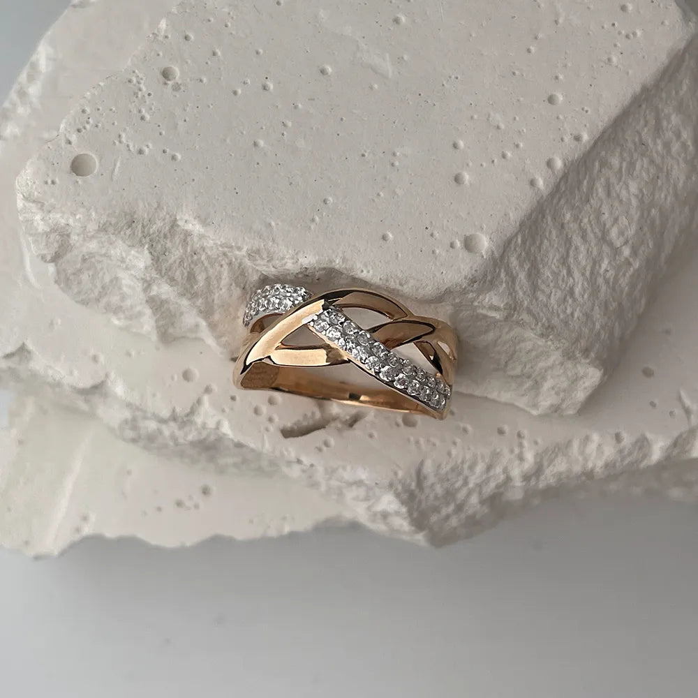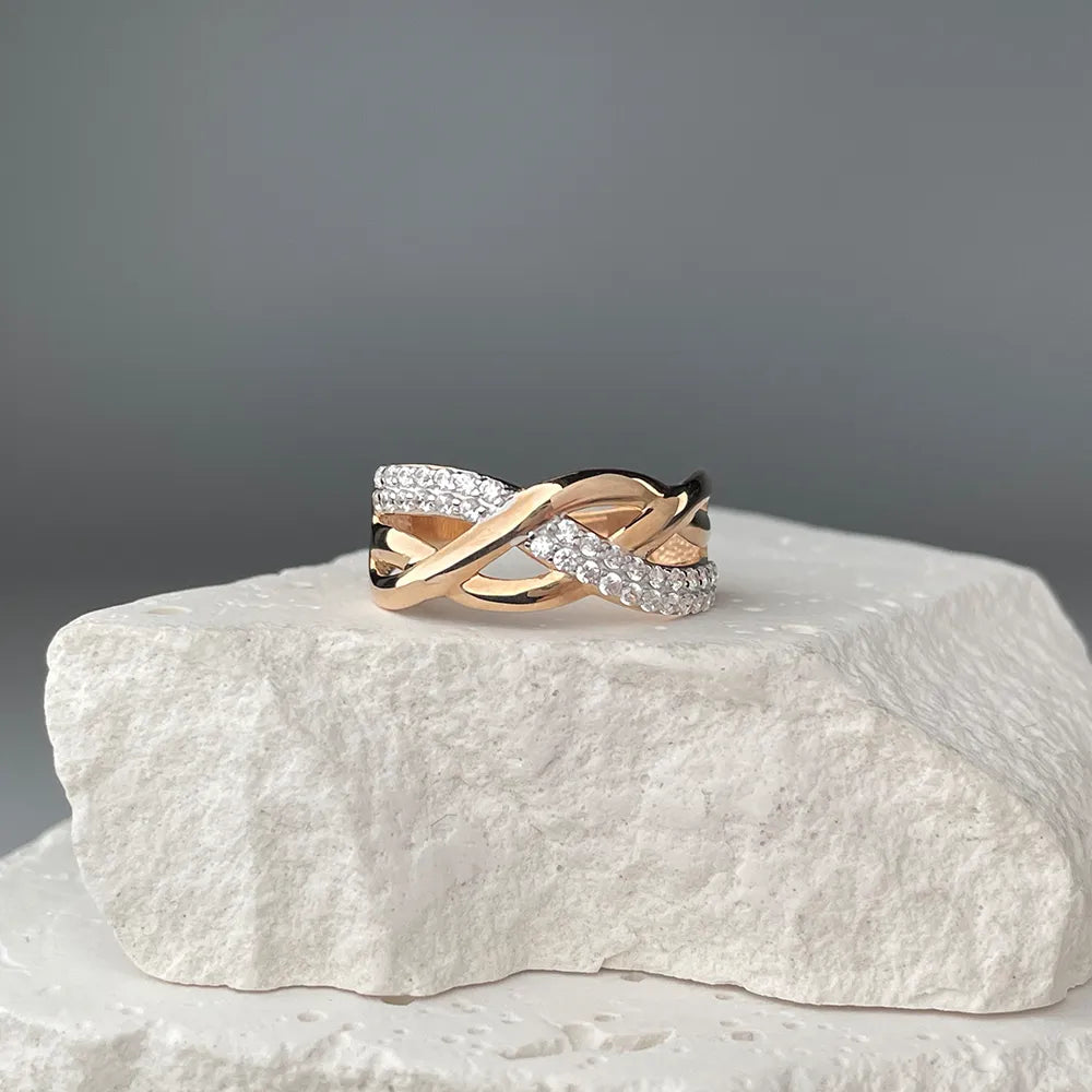 Unikalny design pierścionka to elegancki splot złotych nici, jakby ucieleśniający w metalu samą istotę wieczności. Ten splot, przypominający koronkowy wzór, tworzy wrażenie lekkości i zwiewności, jednocześnie zachowując wytrzymałość i trwałość produktu.