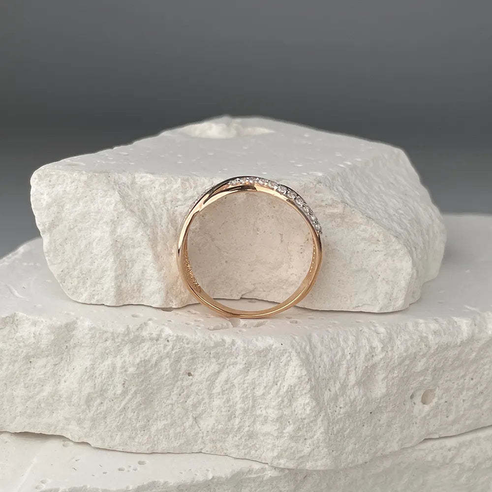 Prawdziwym skarbem tego pierścionka jest wspaniała kompozycja 34 cyrkonii sześciennych o łącznej masie 0,575 karata. Każdy kamień, oszlifowany na kształt idealnego koła, lśni milionami faset, tworząc olśniewającą grę światła i cienia. Ich nieskazitelna biel kontrastuje z ciepłym odcieniem czerwonego złota, tworząc harmonijną całość przypominającą taniec ognia i lodu.