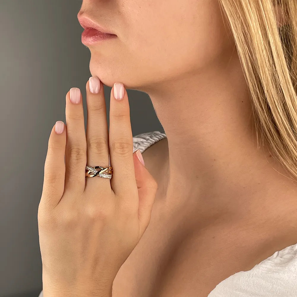 Pierścionek z czerwonego złota z cyrkoniami to nie tylko biżuteria, ale prawdziwe arcydzieło sztuki jubilerskiej, które potrafi przemienić każdy obraz w dzieło sztuki. Będzie idealnym towarzyszem dla nowoczesnej i pewnej siebie kobiety, ceniącej piękno, elegancję i indywidualność. Niech jego blask rozświetli Twoją drogę, wypełniając każdy dzień blaskiem i urokiem.