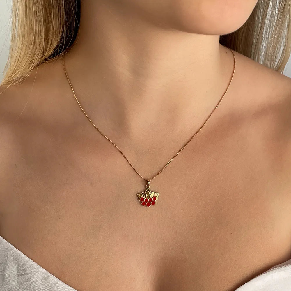 Delikatna, filigranowa praca rzemieślników nadaje wisiorowi niepowtarzalny urok i elegancję. Jagody kaliny, niczym rubinowe krople, mienią się na tle złota, przyciągając wzrok soczystym kolorem.