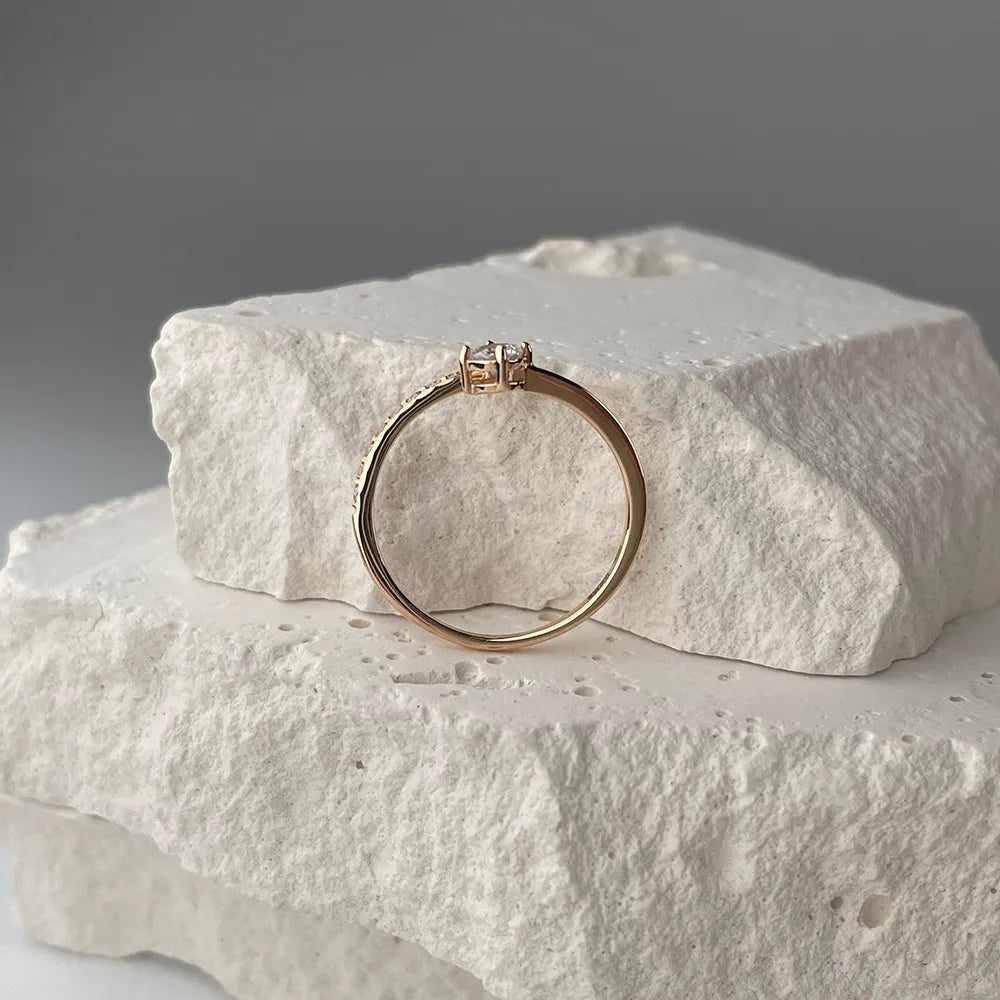 Pierścionek jest inkrustowany cyrkoniami sześciennymi - sztucznymi kryształami, które nie ustępują wytrzymałością i walorami estetycznymi drogocennym diamentom, ale jednocześnie kosztują mniej, co ma pozytywny wpływ na cenę produktu. Jedna strona otwartej ramki jest zwieńczona jednym okrągłym kamieniem o masie 0,315 ct, a druga - elegancką ścieżką jedenastu miniaturowych kryształów o masie 0,18 ct. Każdy kamień jest solidnie osadzony w złotej ramce, a inkrustacja ogólnie wygląda bardzo wyrafinowanie i elegancko. Nawet przy niewielkich wymiarach i wadze 1,41 g pierścionek nie pozostanie niezauważony na palcu, nie zginie wśród innych dodatków w zestawie biżuterii.